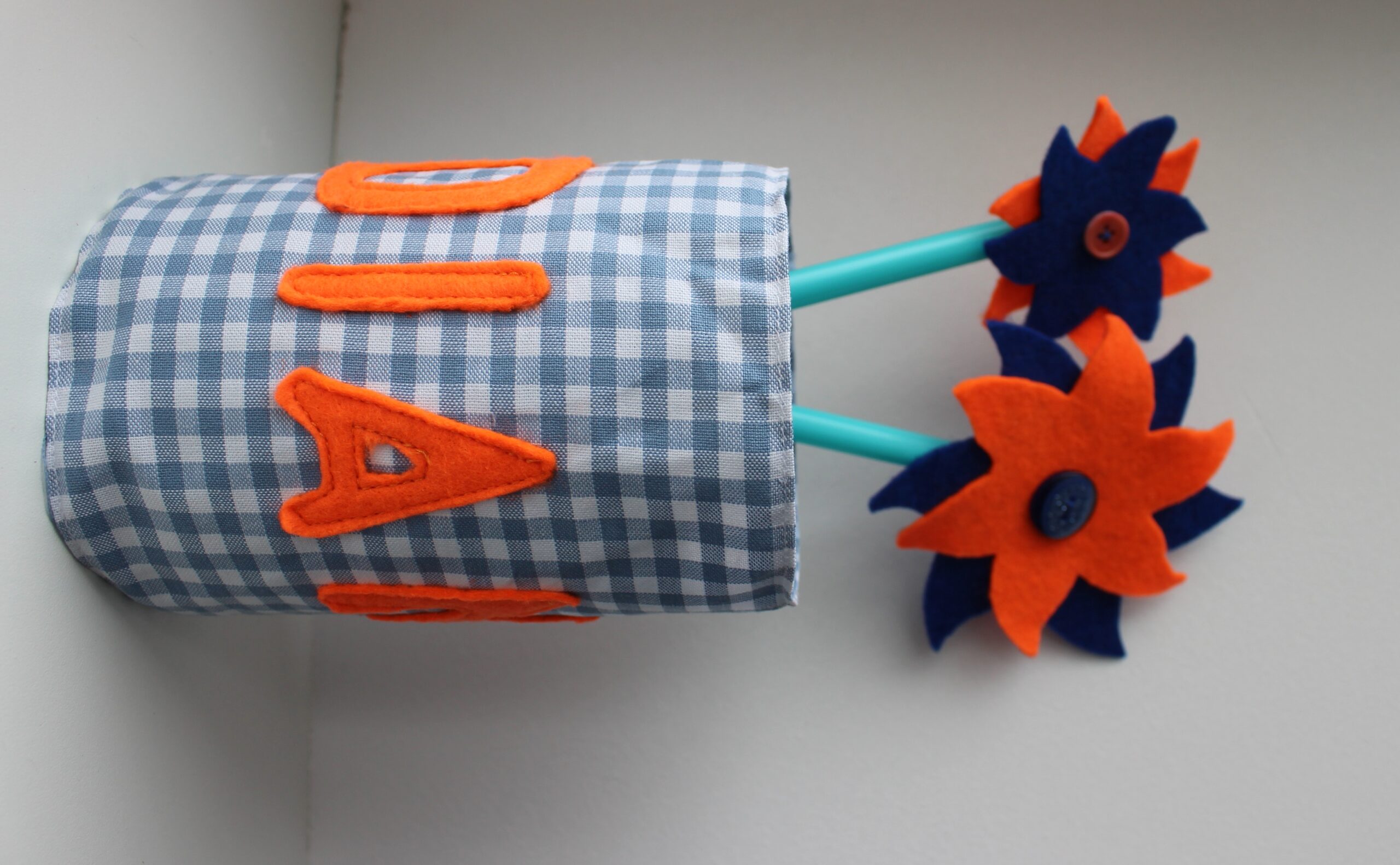 Bij het knutselpakket Bloemenvaas met bloemen kan ieder kind zijn naam (of een andere tekst) maken op de wikkel voor om de pot. Het pakket is er in verschillende kleuren. Mail (beschuitenruitjes@gmail.com) me gerust voor de mogelijkheden.